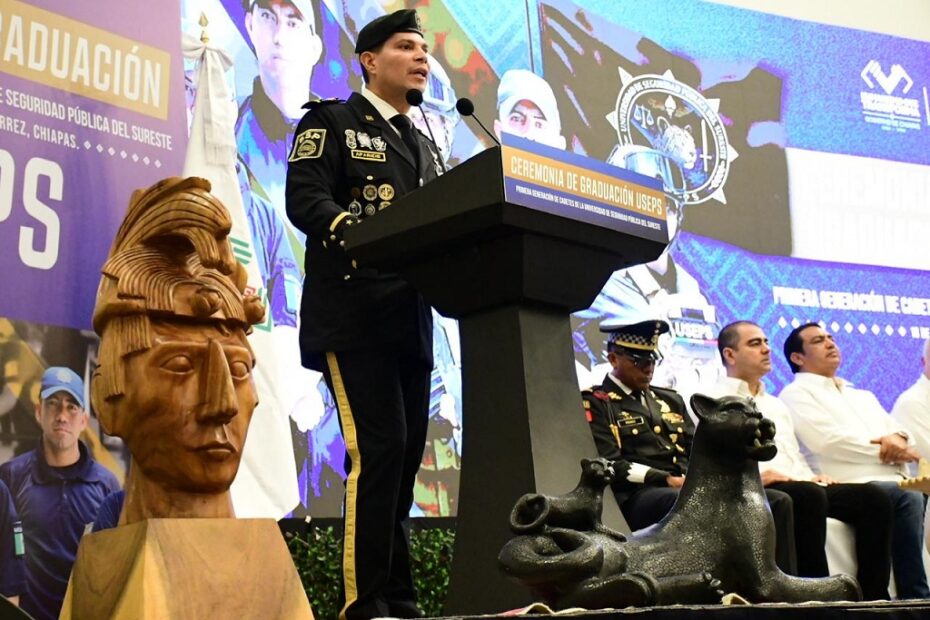 .- El titular de la Secretaría de Seguridad del Pueblo (SSP), Óscar Alberto Aparicio Avendaño, asistió como invitado de honor a la Ceremonia de Graduación de la Primera Generación de Cadetes de la Universidad de Seguridad Pública del Sureste (Useps), donde reconoció la disciplina y esfuerzo de hombres y mujeres que inician una nueva etapa al servicio del pueblo de Chiapas.