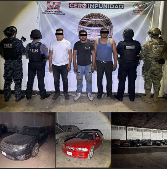 El Grupo interinstitucional, conformado por la Fiscalía General del Estado, la Secretaría de la Defensa Nacional, la Guardia Nacional y la Secretaría de Seguridad del Pueblo, realizaron la detención de Ahmed “N”, Nahum “N” y Ricardo ”N”, así como el aseguramiento de 34 vehículos en el interior de un inmueble ubicado en el municipio de Huixtla.