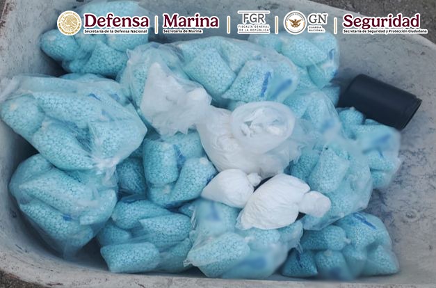 El secretario Harfuch también informó que, en diversas acciones operativas en Sinaloa, en los municipios de Culiacán y Cosalá, se aseguró droga y sustancias químicas. Primero, derivado de trabajos de inteligencia, se localizó un vehículo con 23 kilos con 211 mil pastillas de fentanilo, dosis de cocaína, 500 kilos y 130 litros de metanfetamina, el valor de la droga es de 246 millones de pesos.