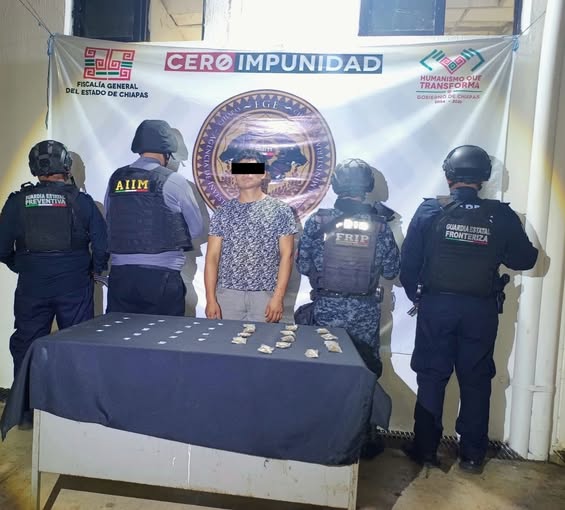 La Secretaría de Seguridad del Pueblo (SSP) a través de la Fuerza de Reacciones Inmediata Pakal (FRIP) en coordinación con la Dirección de la Guardia Estatal Fronteriza, la Guardia Estatal Preventiva y la Agencia de Investigación e Inteligencia Ministerial (AIIM) de la Fiscalía General del Estado (FGE), puso a disposición a una persona del sexo masculino como presunto responsable del delito contra la salud, en su modalidad de posesión simple en Puerto Madero municipio de Tapachula.