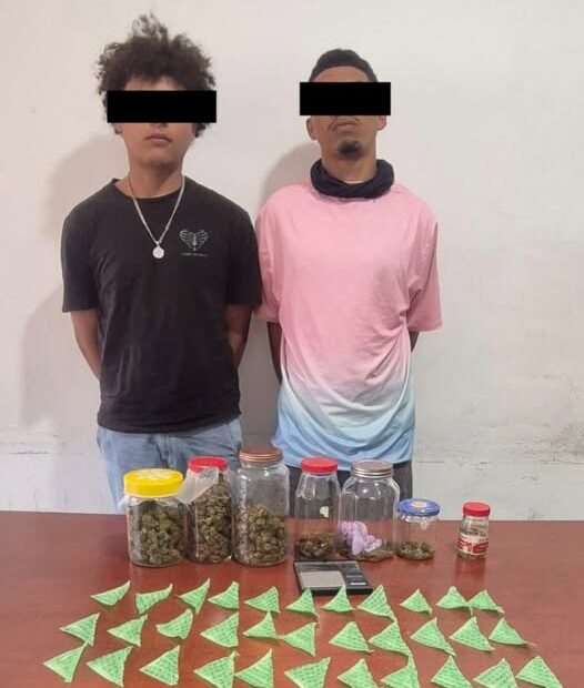 Durante patrullajes de prevención, disuasión del delito y proximidad social, los elementos de seguridad detuvieron a Denis “N” y Ángel “N”, a quienes les aseguraron 33 dosis de sustancia cristalina con las características del cristal, 6 frascos de vidrio con hierba de color verde y seca, con las características físicas a la marihuana, un frasco con semillas, una báscula gramera y una motocicleta marca Vento.
