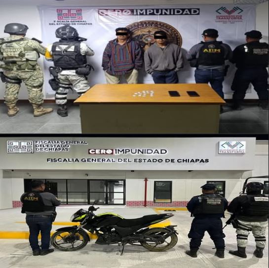 En un operativo interinstitucional conformado por la Fiscalía General del Estado, en coordinación con la Secretaría de la Defensa Nacional, la Guardia Nacional, la Fiscalía General de la República y la Secretaría de Seguridad del Pueblo, lograron la detención de Carlos “N”, alias “El Gallo” y de Jensi “N”, alias “El Shagy”, como presuntos responsables del delito contra la salud en su modalidad de narcomenudeo con la variante de posesión con fines de comercio del narcótico conocido como metanfetamina, por hechos ocurridos en la colonia Michoacán del municipio de Jiquipilas.