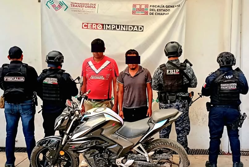 En patrullajes de prevención, disuasión del delito y proximidad social en la colonia Rivera Maya de la Perla del Soconusco, elementos estatales detuvieron a René “N” y Ricardo “N”, quienes jalaban una motocicleta Italika de color negra con franjas moradas, vehículo motorizado despojado al propietario minutos antes.
