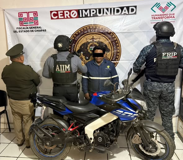 La Secretaría de Seguridad del Pueblo, a través de la Fuerza de Reacción Inmediata Pakal (FRIP), la Subsecretaría Vial Preventiva y de Turismo, en coordinación con la Agencia de Investigación e Inteligencia Ministerial (AIIM) de la Fiscalía General del Estado (FGE) logró el aseguramiento de una motocicleta con reporte de robo y la detención de una persona del sexo masculino en el municipio de Huixtla.