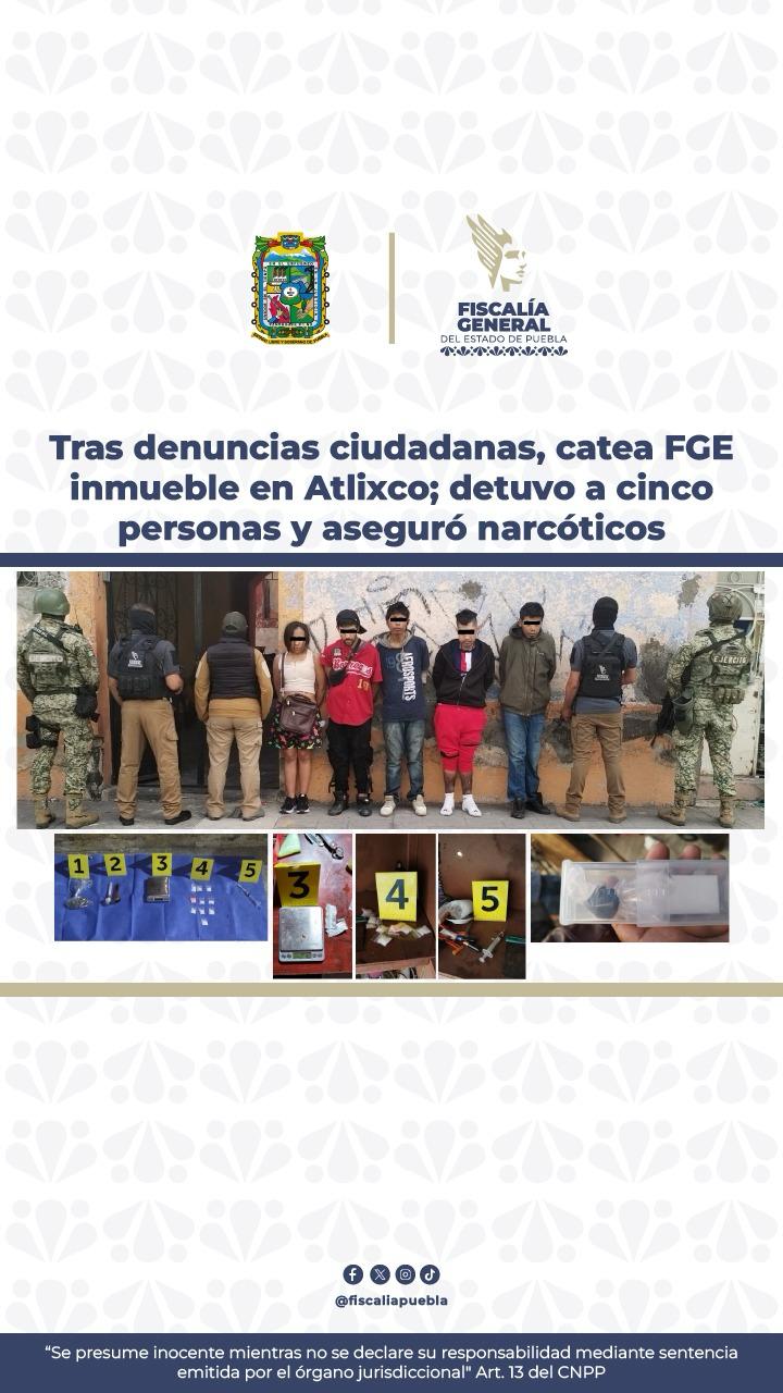 La Fiscalía General del Estado de Puebla detuvo a cinco personas luego de realizar un cateo en un inmueble localizado en el municipio de Atlixco. Mismo que fue señalado por ser un espacio en donde se vendían drogas.