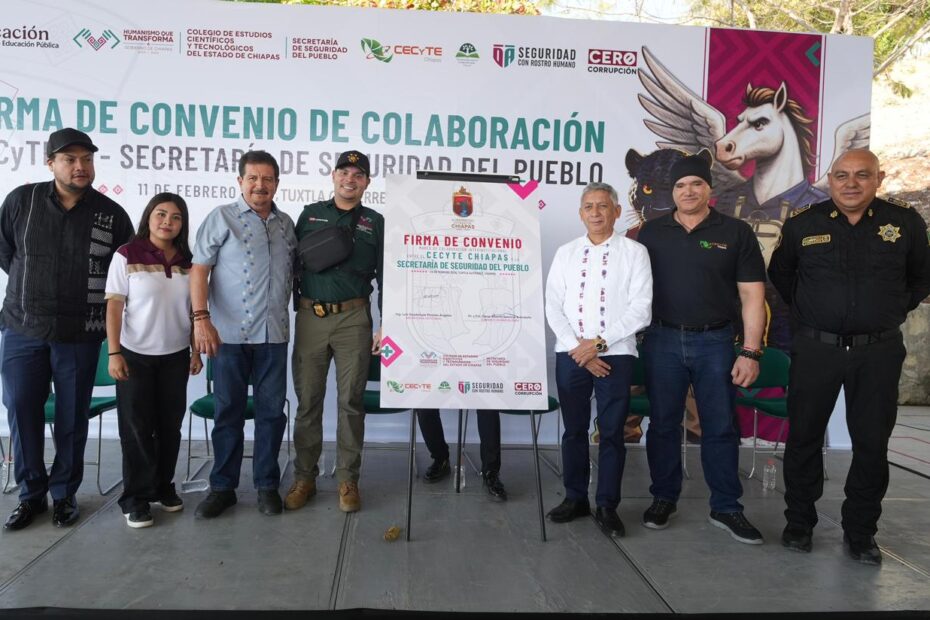 Con el objetivo de fortalecer la coordinación interinstitucional y promover acciones conjuntas en beneficio de la comunidad estudiantil, el secretario de Seguridad del Pueblo, Óscar Alberto Aparicio Avendaño, junto al director general del Colegio de Estudios Científicos y Tecnológicos del Estado de Chiapas (Cecytech), Luis Guadalupe Morales Ángeles, llevaron a cabo la firma de convenio para prevenir el delito y fortalecer la seguridad desde las aulas chiapanecas.