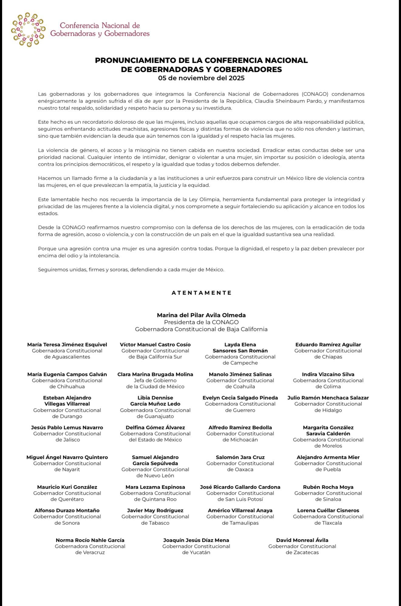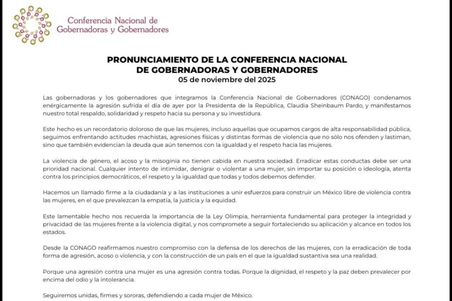 La Conferencia Nacional de Gobernadores CONAGO condena  cualquier agresión a las mujeres, en este caso la agresión hacia la Presidenta de México, Dra. Claudia Sheinbaum Pardo.