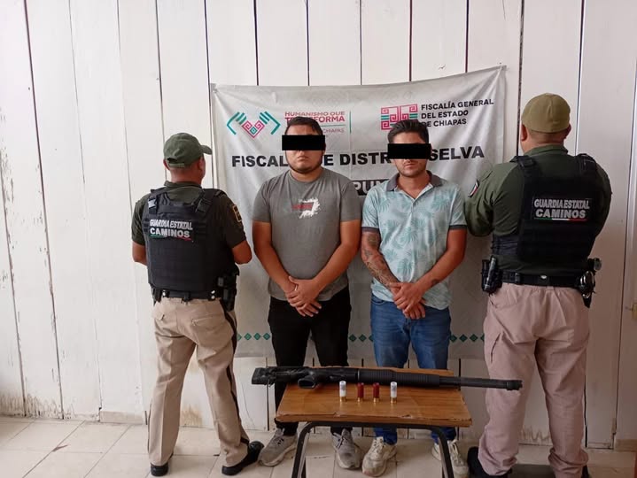 La Secretaría de Seguridad del Pueblo (SSP), a través de la Fuerza de Reacción Inmediata Pakal (FRIP) y la Guardia Estatal de Caminos en coordinación con la Agencia de Investigación e Inteligencia Ministerial (AIIM) de la Fiscalía General del Estado (FGE), detuvieron a dos personas del sexo masculino por posesión de arma de fuego larga en el municipio de Ocosingo.