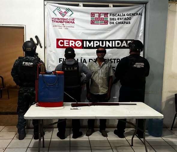 Derivado de patrullajes de vigilancia y de proximidad social, el grupo interinstitucional detuvo a Jorge “N” de nacionalidad guatemalteca, a quien le aseguraron un arma larga, rifle, Winchester, calibre 22 mm, una bomba fumigadora y dinero en efectivo.