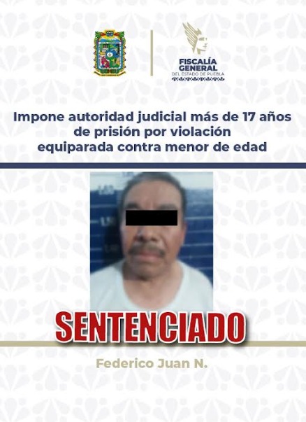Como resultado del desahogo del juicio oral, la Fiscalía General del Estado de Puebla (FGE) obtuvo sentencia condenatoria en contra de Federico Juan N., de 71 años, por su responsabilidad en el delito de violación equiparada, en agravio de una menor de edad de 12 años, hecho acontecido en el municipio de Tehuacán.