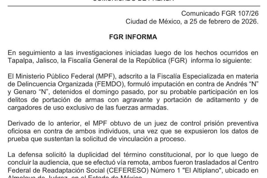 La Fiscalía General de la República (FGR) informa lo siguiente en seguimiento a las investigaciones iniciadas luego de los hechos ocurridos en Tapalpa, Jalisco