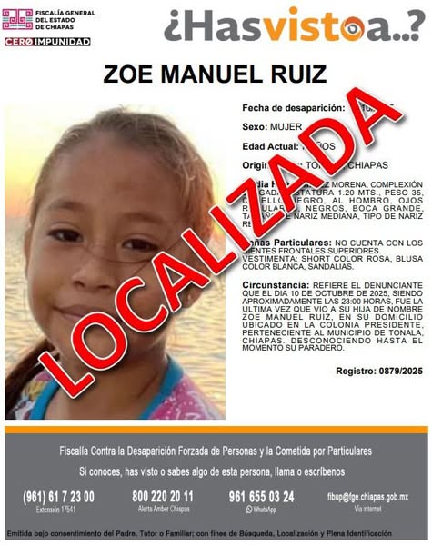 Localizan a Zoe, pequeña reportada como desaparecida en Tonalá