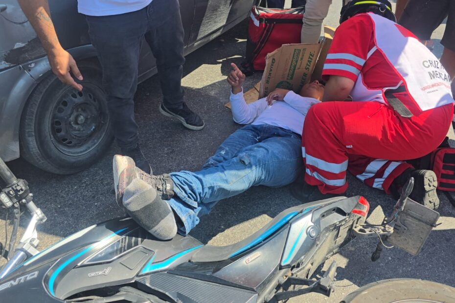 Dos motociclistas resultaron lesionados tras protagonizar un accidente vial en el cruce de la avenida López Mateos, luego de que presuntamente circularan a exceso de velocidad y omitieran una señal de alto mientras competían entre sí, lo que derivó en un choque contra un automóvil que tenía preferencia de paso.