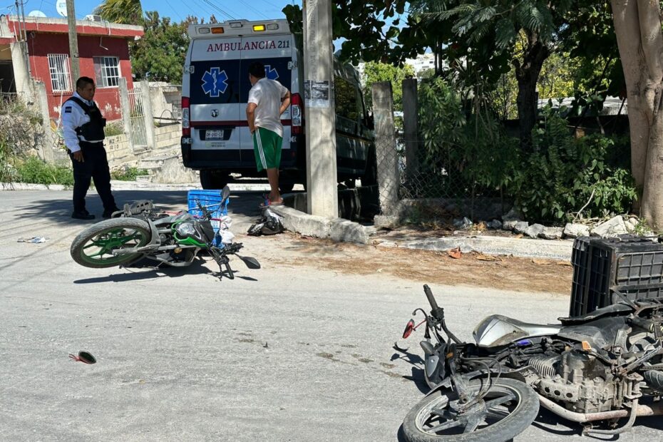 Paramédicos del Sector Salud, agentes policiales y familiares auxiliaron a dos motociclistas que resultaron lesionados tras colisionar de frente en calles de la colonia 20 de Noviembre. El percance fue causado por uno de los conductores, quien avanzaba a exceso de velocidad y no respetó su alto de seguridad, provocando que ambos terminaran tirados sobre el pavimento.