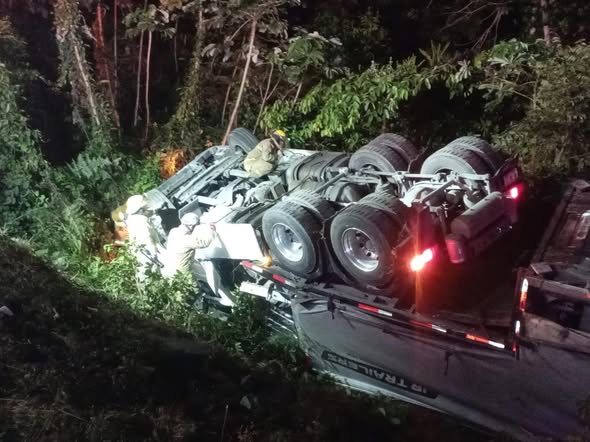 De acuerdo con el testimonio de uno de los tripulantes, otro tráiler realizó un rebase peligroso, invadiendo carril contrario y obligándolos a maniobrar bruscamente. En ese movimiento, la unidad fue golpeada en un costado, perdiendo el control hasta salir de la carpeta asfáltica y volcarse.