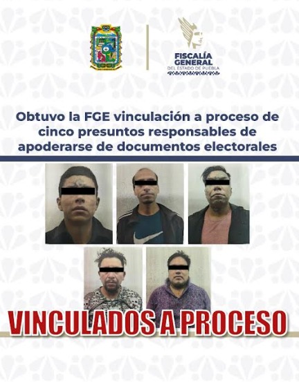 Con base en las pruebas presentadas por la Fiscalía General del Estado, se logró la vinculación a proceso de Jesús N., José Luis N., Miguel Alejandro N., Carlos N y Emilio N., por su presunta participación en el delito de apoderamiento de documentos públicos electorales, en el municipio de Tlapanalá.
