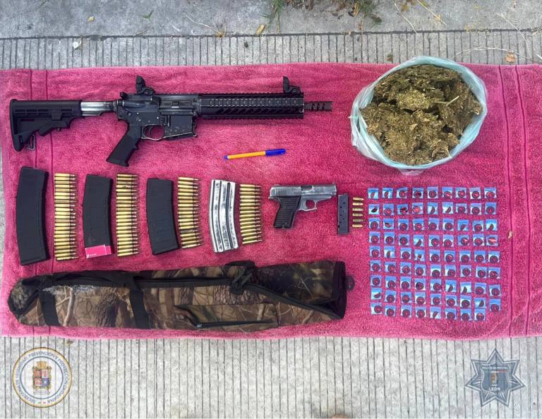 León, Guanajuato. Como parte de las acciones de vigilancia, inteligencia y presencia operativa que se mantienen de manera permanente en las zonas rurales del municipio, la Secretaría de Seguridad, Prevención y Protección Ciudadana logró la detención de dos hombres en posesión de armamento de uso exclusivo del Ejército y diversas dosis de droga.