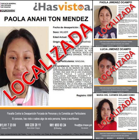 La Fiscalía General del Estado localizó a dos menores, una de 15 y otra de 16 años de edad, así como a dos jóvenes, de 20 y 22 años de edad, quienes contaban con reporte de Persona No Localizada en el municipio de Tuxtla Gutiérrez.