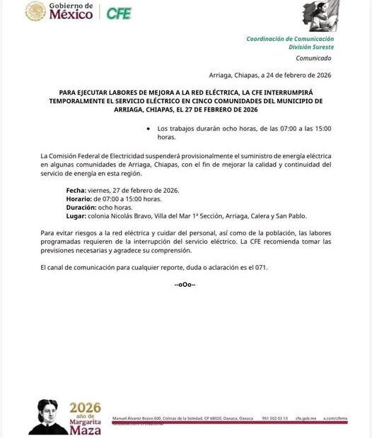 Buenos días mi gente, les informo que CFE, con el objetivo de ejecutar labores de mejora en la red eléctrica, este próximo 27 de febrero realizará una interrupción temporal del servicio eléctrico en las #comunidades de Nicolás Bravo, San Pablo, Villa del Mar, Calera y Arriaga.