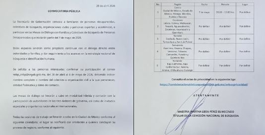 La Secretaría de Gobernación convoca a familiares de personas desaparecidas, colectivos de búsqueda, organizaciones civiles y personas expertas y académicas, a participar en las Mesas de Diálogo con Familias y Colectivos de Búsqueda de Personas Desaparecidas que iniciarán partir del 7 de mayo de 2026.