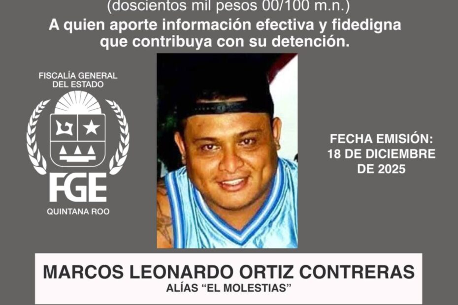 La FGE de Quintana Roo ofrece una recompensa de $200 mil pesos a quien aporte información efectiva y fidedigna que contribuya a la localización de la persona identificada como Marcos Leonardo Ortiz Contreras.