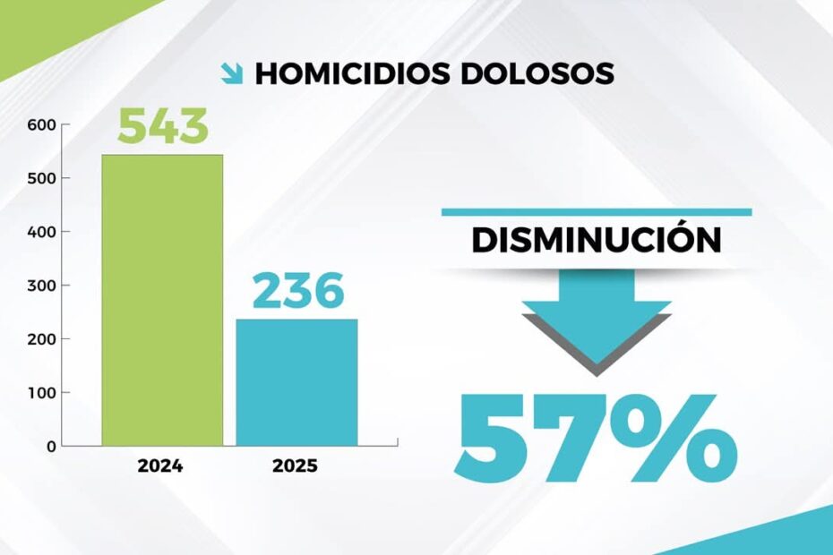 Destaca disminución de 57 por ciento en la incidencia de homicidios dolosos, al pasar de 543 en 2024 a 236 en el presente año.