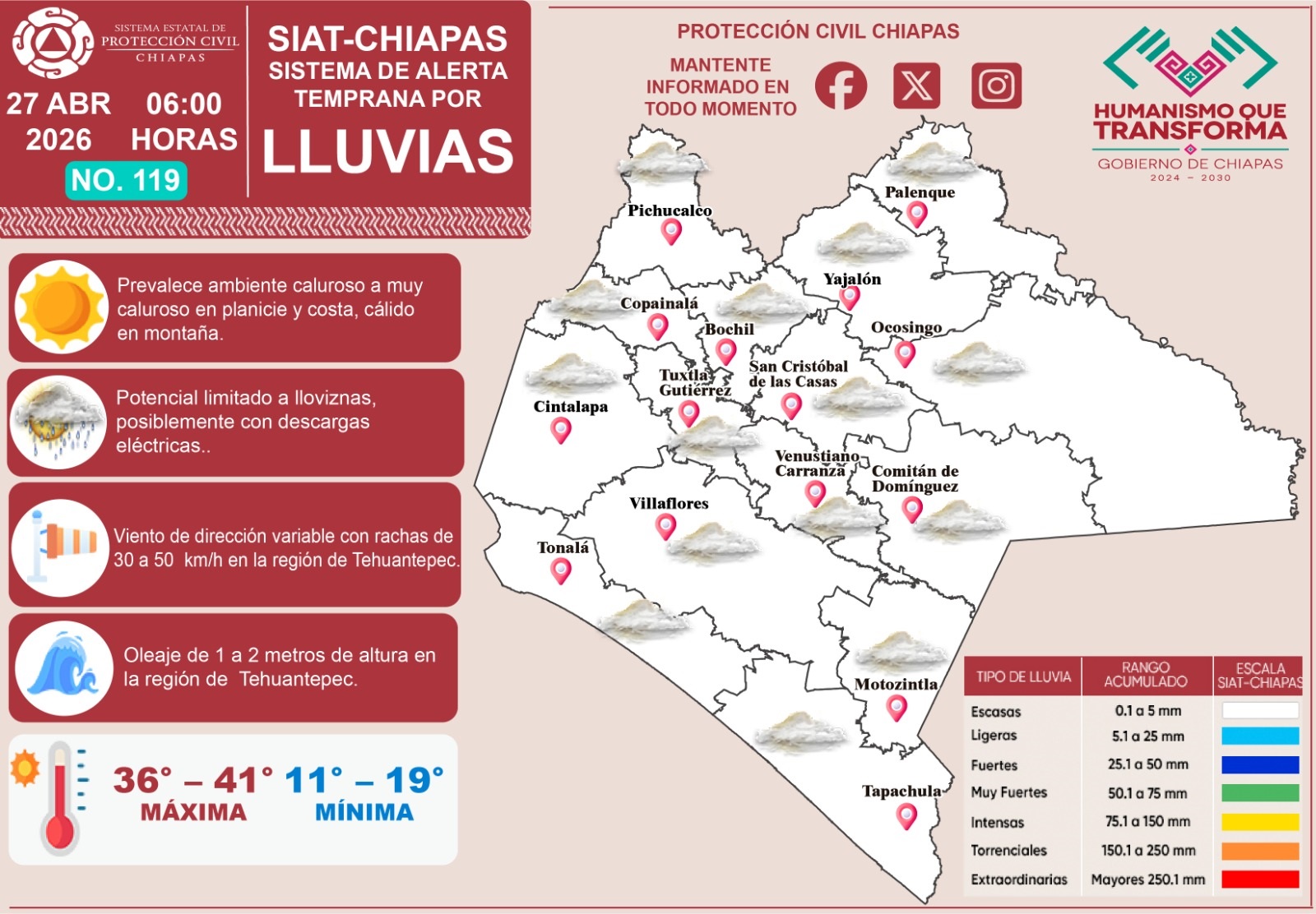 Hoy, 27 de abril del 2026, el Sistema de Alerta Temprana por #Lluvias (#SIAT) de #ProtecciónCivil Chiapas emite el pronóstico de lluvias en nuestro estado. 🌧⛈