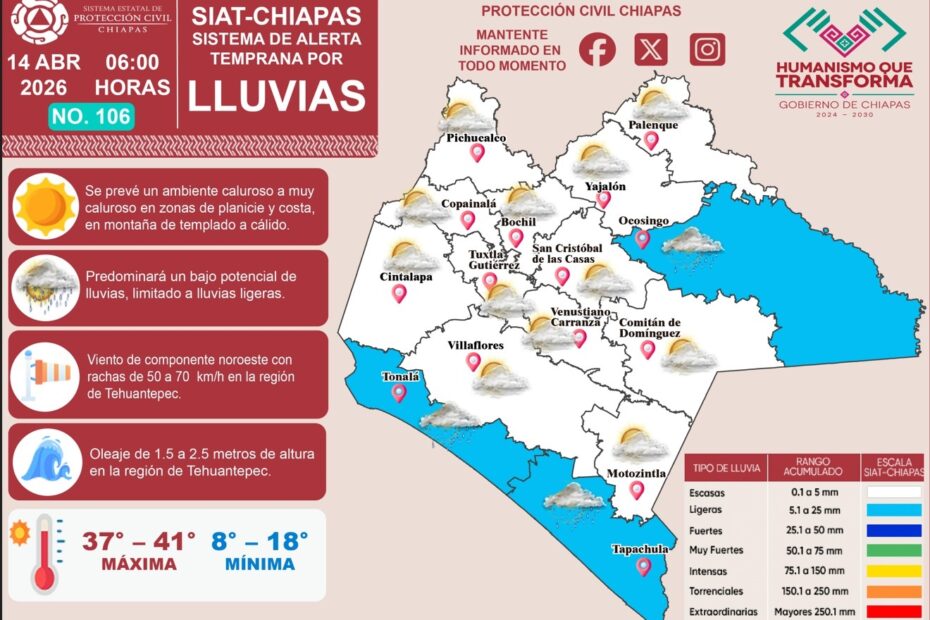 Hoy, 14 de abril del 2026, el Sistema de Alerta Temprana por #Lluvias (#SIAT) de #ProtecciónCivil Chiapas emite el pronóstico de lluvias en nuestro estado. 🌧⛈