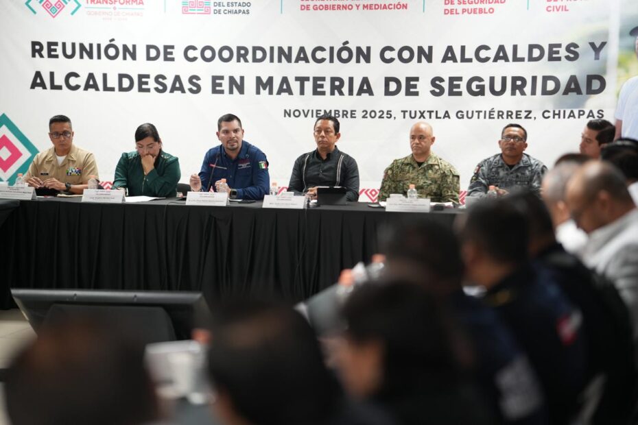 Tuxtla Gutiérrez, Chiapas; 18 de noviembre de 2025.- Con el objetivo de continuar garantizando la seguridad en todos los municipios, el Secretario de Seguridad del Pueblo, Óscar Alberto Aparicio Avendaño, participó en la Reunión de Coordinación con Alcaldes y Alcaldesas en Materia de Seguridad, convocada por el fiscal General del Estado, Jorge Luis Llaven Abarca, con el propósito de fortalecer la estrategia estatal de prevención y combate al delito.