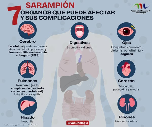 En medio del brote de sarampión en México, es importante recordar que el sarampión no es solo fiebre y manchas en la piel. Puede afectar múltiples órganos y causar complicaciones graves, especialmente en menores de 12 meses, personas inmunodeprimidas y pacientes con malnutrición.