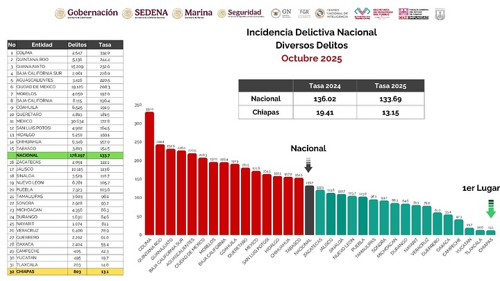 El gobernador del estado de Chiapas Eduardo Ramírez Aguilar informó por medio de sus redes sociales que la entidad volvió a colocarse con mejores resultados en la Incidencia Delictiva Nacional, al ubicarse en primer lugar en disminución de delitos y en segundo lugar en la reducción de delitos de alto impacto.