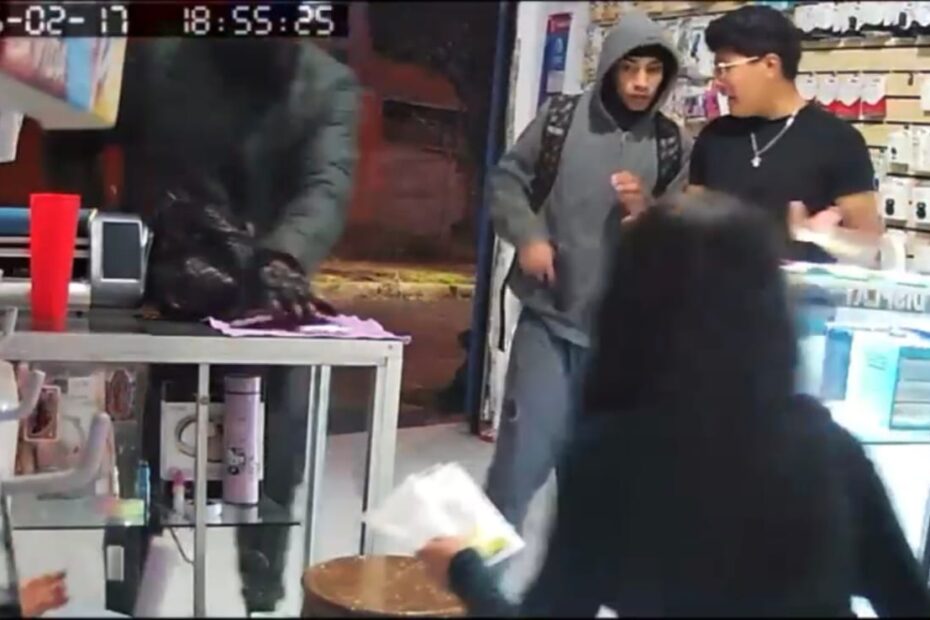 Los hechos se suscitaron la tarde-noche del martes 17 de febrero y todo quedó grabado en las cámaras de seguridad. En la grabación se aprecia cómo ingresan dos sujetos uno de ellos con cubrebocas, fingen preguntar por algo para su celular, y después sacan sus armas de fuego y amenazan a los empleados.