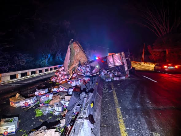 Un tráiler cargado con plátano terminó volcado en el tramo Tapachula–Huixtla, a la altura del kilómetro 275, luego de chocar contra un camión de tres toneladas. La unidad quedó destrozada junto al muro de contención y la carga quedó esparcida por toda la carretera.