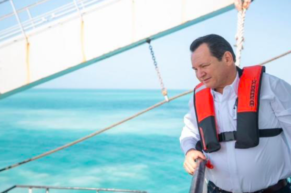 En visita al buque de dragado Fernando de Magallanes, el Gobernador Joaquín Díaz Mena informó que la primera etapa del dragado para la ampliación y modernización del Puerto de Altura de Progreso registra 90% de avance.