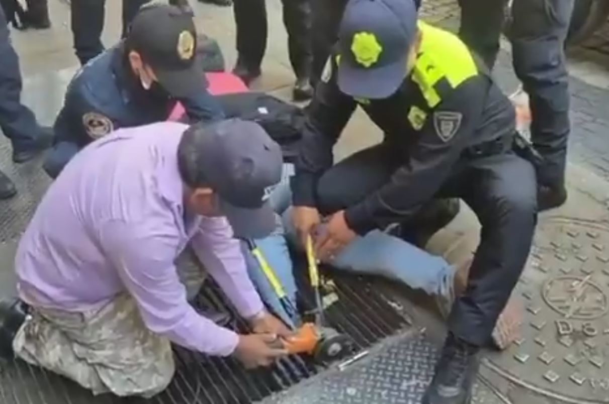 Mujer se atora en la rejilla de