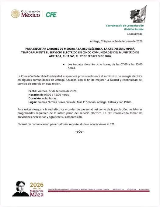 February 26, 2026Alejandra OropezaChiapas,Noticias,Seguridad#FGE,#seguridad,ChiapasBuenos días mi gente, les informo que CFE, con el...