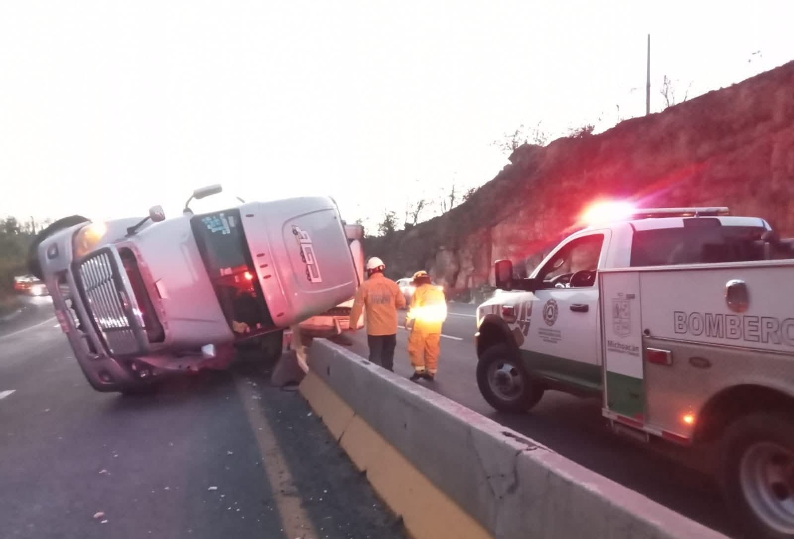 Vuelca tractocamión aguacatero en la carretera Morelia-Pátzcuaro