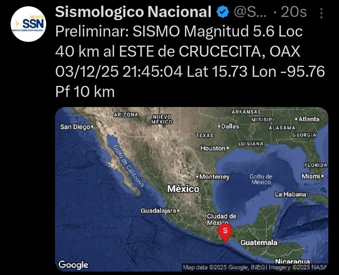 December 3, 2025Alondra OliveraNoticias,OaxacaLa noche de este miércoles, se registró un fuerte sismo...
