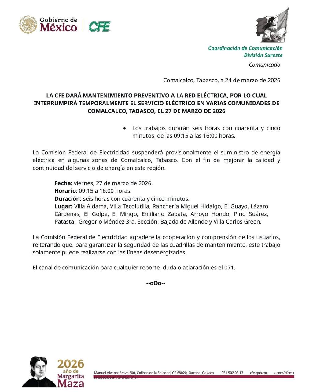 March 25, 2026Veronica LopezTabascoTabascoLa Comisión Federal de Electricidad suspenderá provisionalmente el suministro de...