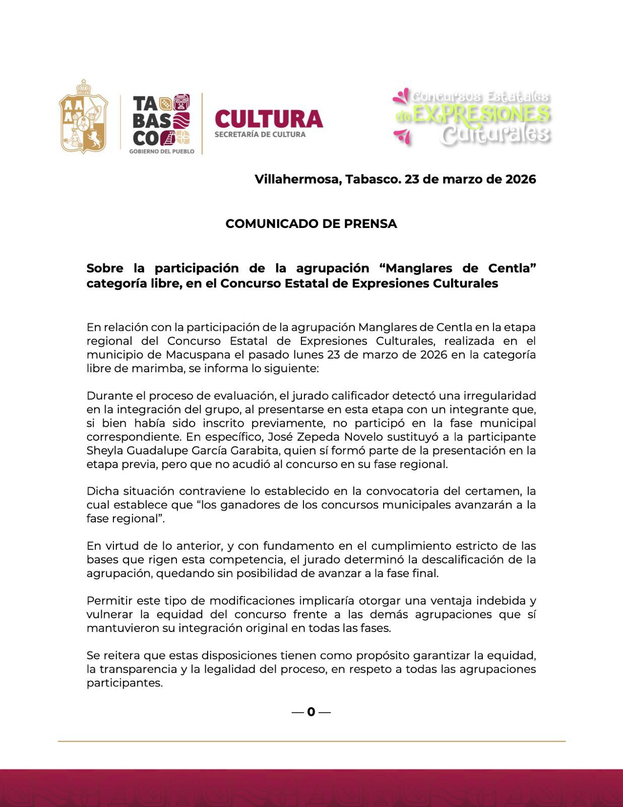 March 24, 2026Veronica LopezTabascoTabascoLa Secretaría de Cultura Tabasco informó la descalificación de la...