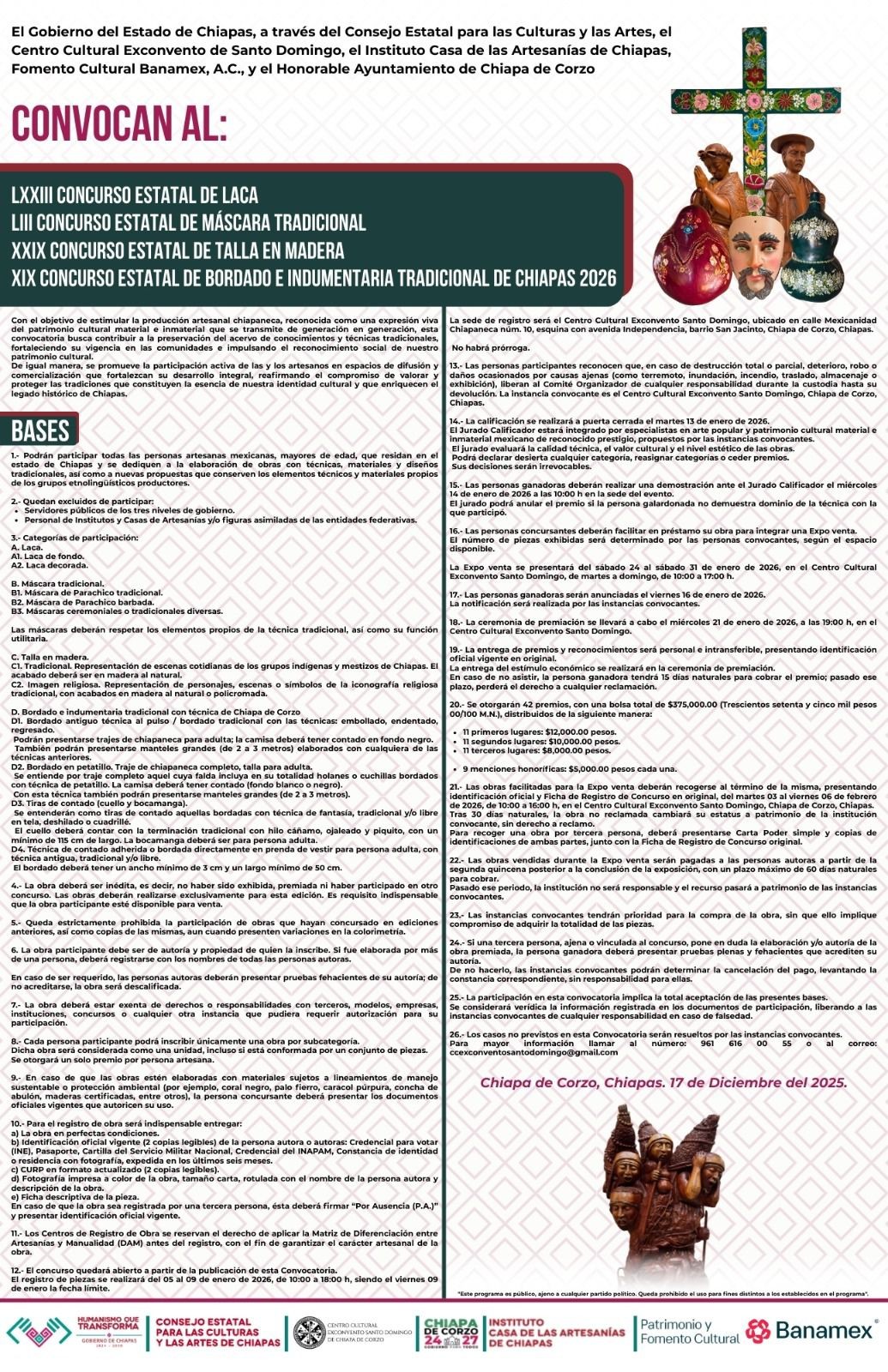 December 17, 2025Jesus OrtizChiapas,Educación,Tapachula* Se otorgará una bolsa económica de 375 mil pesos con un total de 42 premios que serán distribuidos en primeros,así como menciones honoríficas,segundos y terceros lugaresCon el objetivo de preservar, reconocer y fortalecer las técnicas...