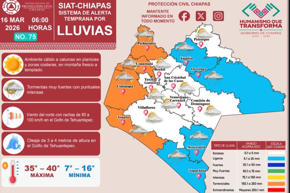 Hoy, 16 de marzo del 2026, el Sistema de Alerta Temprana por #Lluvias (#SIAT) de #ProtecciónCivil Chiapas emite el pronóstico de lluvias en nuestro estado.… Read More »Pronostican lluvias torrenciales para Chiapas