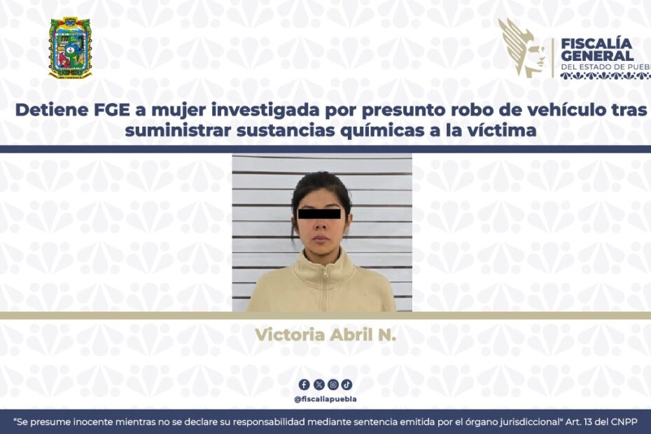 La Fiscalía General del Estado de Puebla dio cumplimiento a una orden de aprehensión en contra de Victoria Abril N., por su presunta responsabilidad en… Read More »Detiene FGE a mujer investigada por presunto robo de vehículo tras suministrar sustancias químicas a la víctima