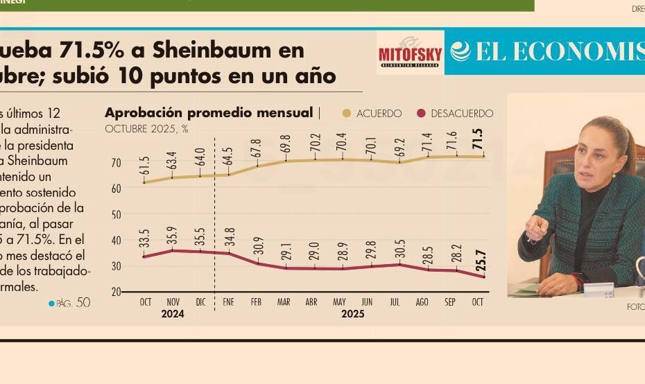En octubre, siete de cada diez mexicanos (71.5%) expresaron estar de acuerdo con el desempeño de la presidenta Claudia Sheinbaum. A un año de haber… Read More »Sheinbaum alcanza 71.5% de aprobación en octubre; crece 10 puntos en un año