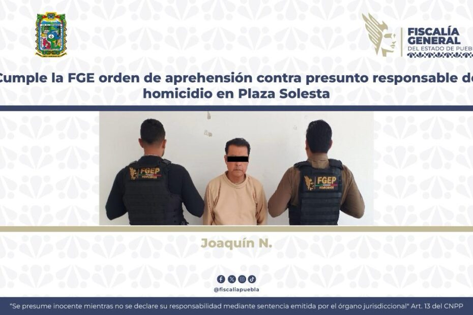 Como resultado de trabajo de campo y gabinete, la Fiscalía General del Estado de Puebla cumplimentó una orden de aprehensión en contra de Joaquín N.,… Read More »Cumple la FGE orden de aprehensión contra presunto responsable de homicidio en Plaza Solesta