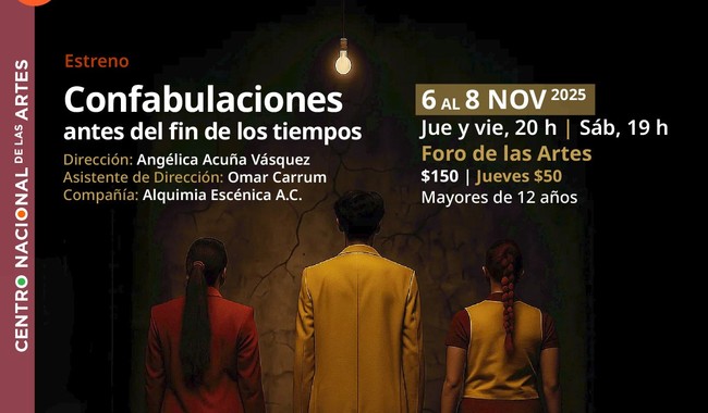 Con la interpretación de Natalia Barragán, Ivana Pacheco y Luis Aguirre, Confabulaciones antes del fin de los tiempos ofrecerá funciones del 6 al 8 de noviembre, jueves y viernes, a las 20:00 h; y sábado, a las 19:00 h, en el Foro de las Artes. La entrada tiene un costo de 150 pesos con promoción “Jueves de 50 pesos” y 2×1 comprando los miércoles a través de la página web cenart.comprarboletos.com; y los viernes en taquillas. Para más información consulta la página cenart.gob.mx.