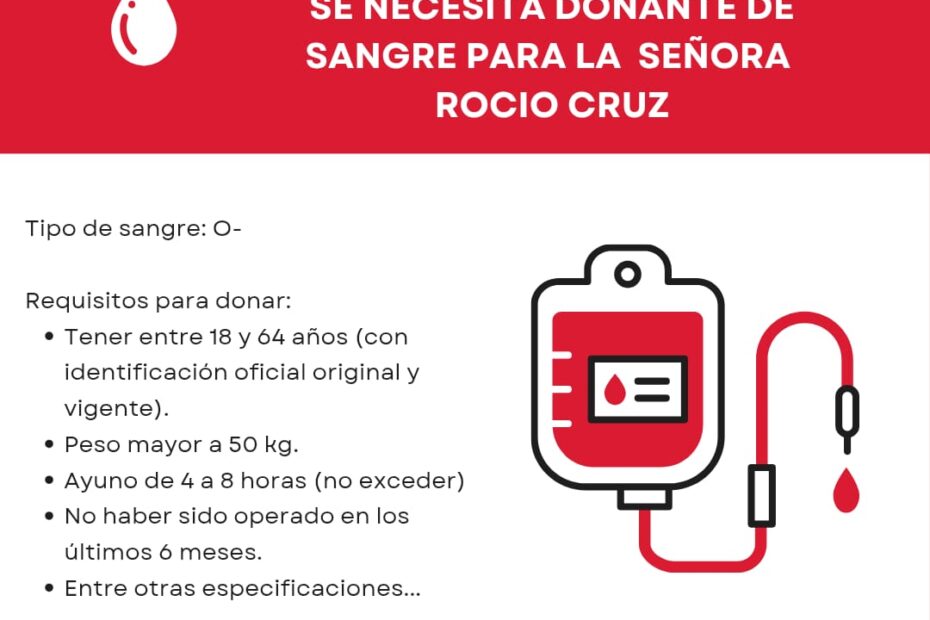 Se necesita donante de sangre tipo O negativo (O-) para la Sra. Rocío Cruz.
