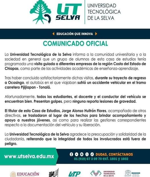 La noche de este martes se registró un fuerte accidente en el que se vieron involucrados un tráiler y un autobús con estudiantes. Los hechos… Read More »Chocan tráiler y autobús con estudiantes de la Selva en carretera Tonalá – Pijijiapan