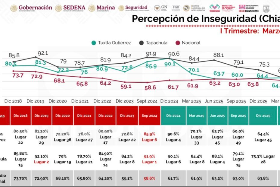 Tuxtla Gutiérrez y Tapachula se alejaron de los primeros lugares de percepción de inseguridad a nivel nacional.