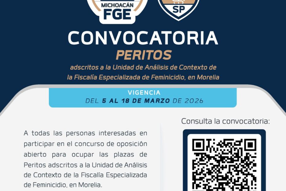 Con el compromiso de fortalecer las investigaciones con perspectiva de género y consolidar equipos técnicos altamente especializados, la Fiscalía General del Estado de Michoacán (FGE)… Read More »Fiscalía de Michoacán emite convocatoria para integrar personal pericial a la Fiscalía Especializada de Feminicidio